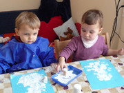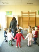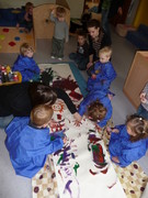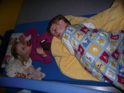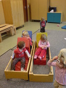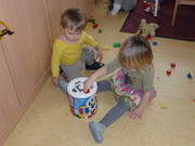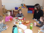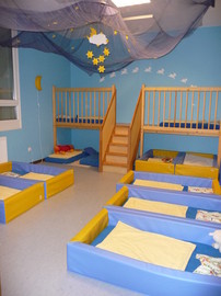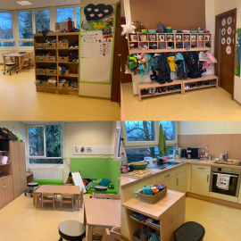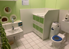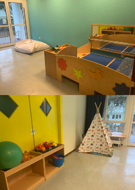 Das Spielzimmer mit kleiner Hochebene. Unser Bad in der Krippe mit Wickeltisch.